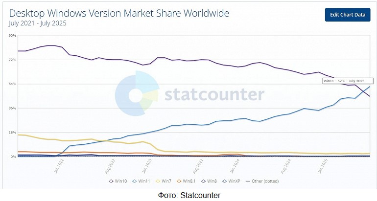 Доля Windows 11 среди всех версий ОС Microsoft Windows впервые достигла уровня в 52%