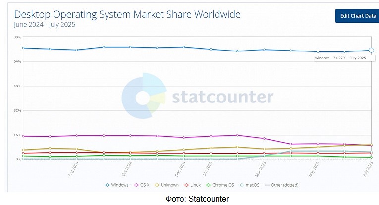 На графике видно, что в последние недели доля ПК с Windows 11 резко увеличилась, а доля ПК с Windows 10 резко снизилась. Это совпало с новой волной предупреждений Microsoft о том, что с осени текущего года обновления Windows 10 станут платными.