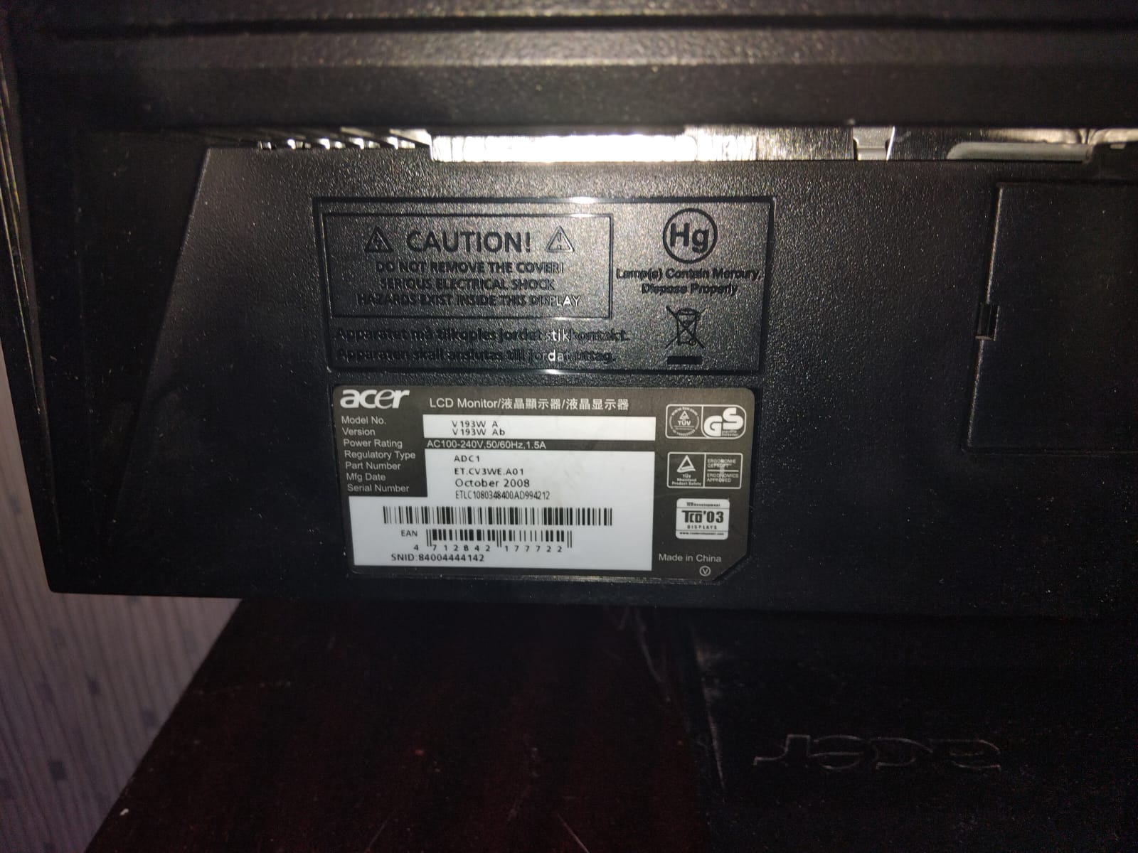 Монитор Acer ЖК 19 ДюймовAcer Model: V193W AВыходы VGA, питаниеРазрешение HD 1366*768